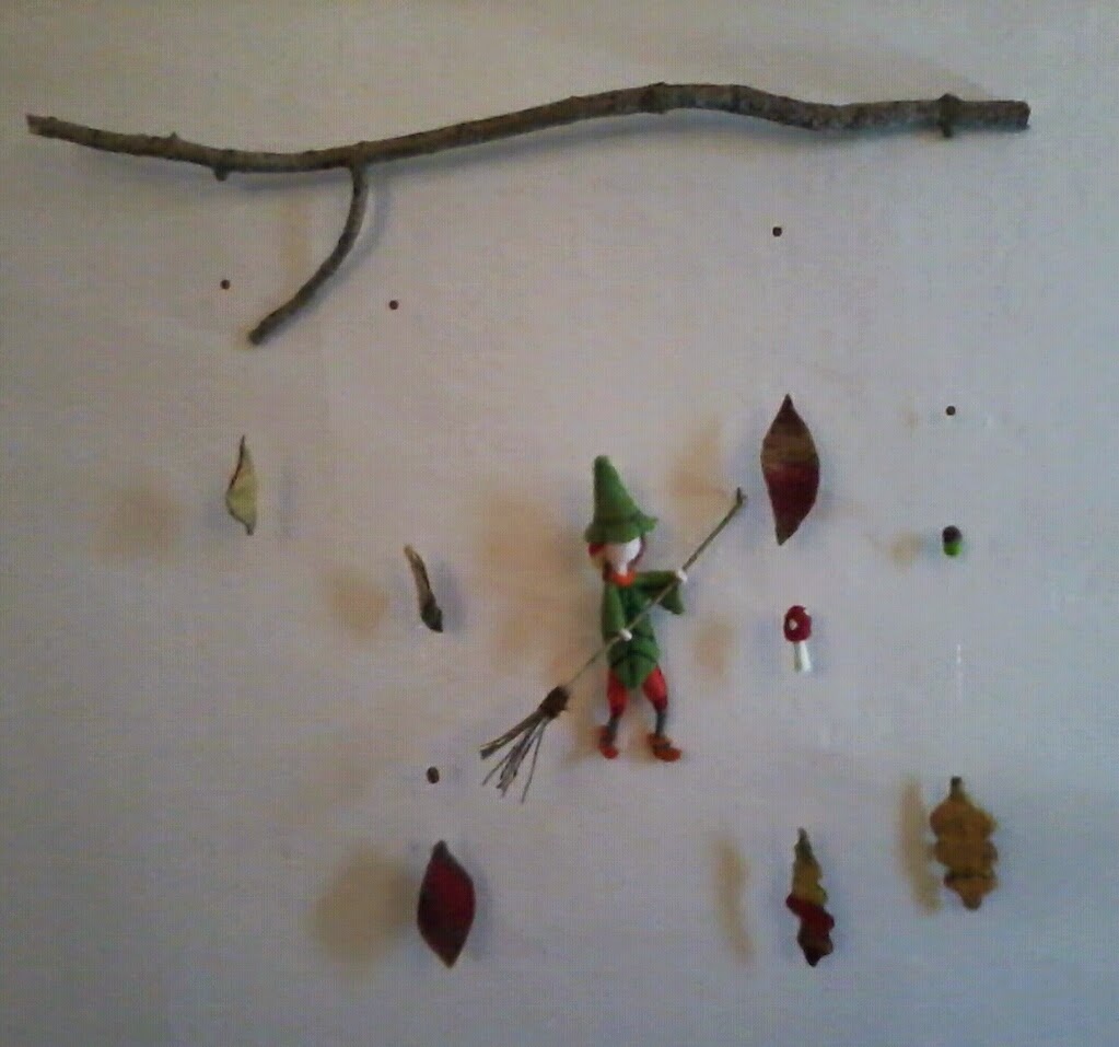 I went on a foraging mission in a local wood and found lots of sticks and moss & things that I thought would come in useful. The whole idea for this mobile came when I used some of the sticks & twigs to make a miniature broom, using my glue gun to hold them all together & wrapping with wool to give the effect of a broom.